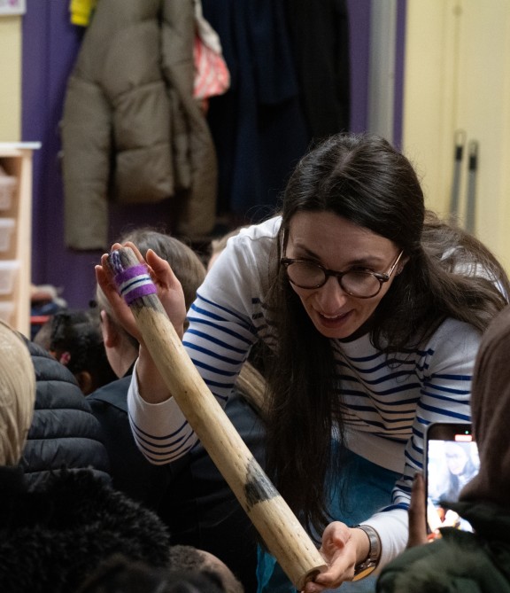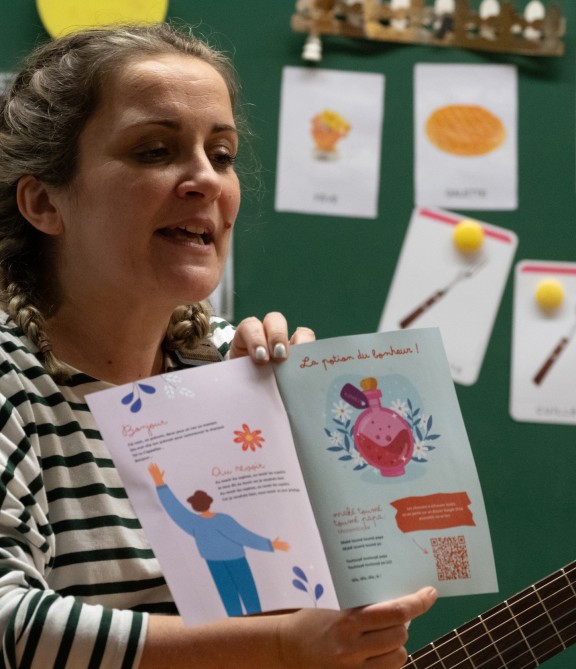 Au programme de chaque atelier : la découverte d’instruments différents, des chansons originales et même quelques mouvements dansés, toujours dans un univers poétique et espiègle. Le dispositif scénique est réduit, pour être au plus proche de l’enfant. Une guitare, un sac rempli d’instruments en tout genre, et on y va. C’est une volonté d’aller à la rencontre de petits groupes d’enfants ; Hélène et Blandine observent pour pouvoir mieux rebondir et soulignent que dans le spectacle, rien n’est figé.