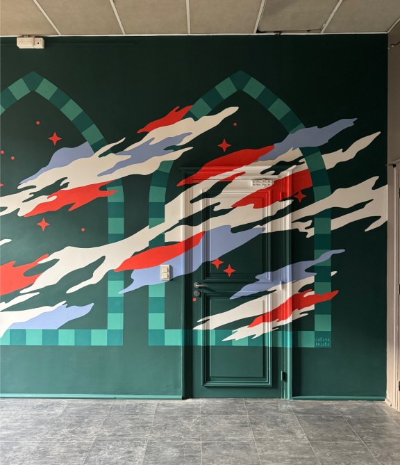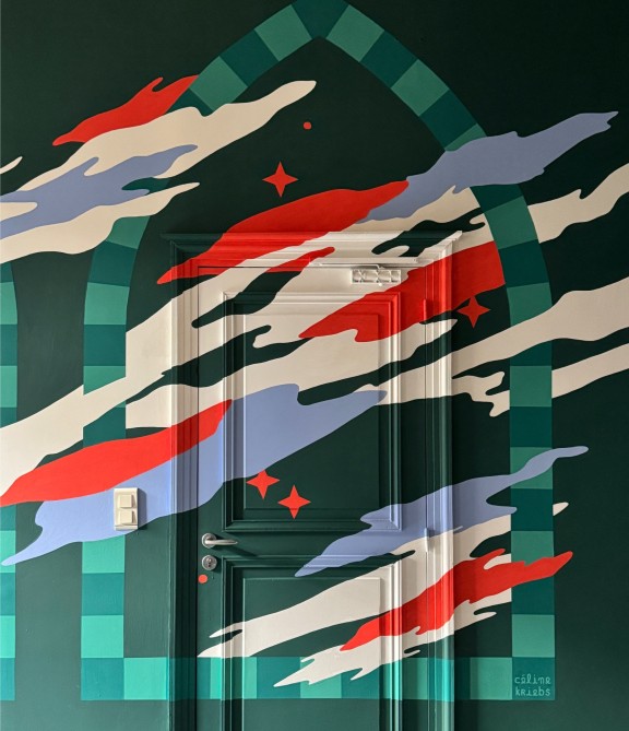 Le projet de Céline Kriebs rend hommage à l’architecture singulière du lieu — notamment ses arches, symboles d’ouverture et de passage. Celles-ci deviennent les piliers de la composition, traversées de volutes et de nuages, comme une évocation du mouvement d’une foule, d’une respiration collective, ou de la fumée légère qui s’élève d’un concert.